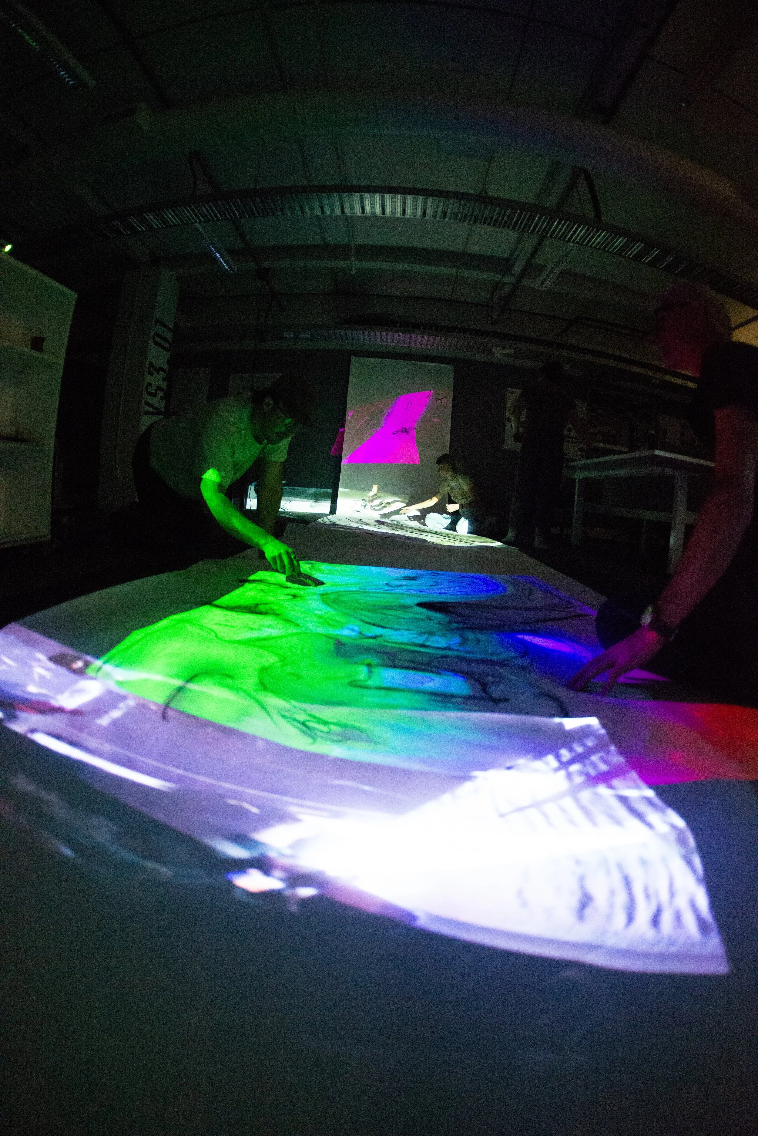 Old House Section is a performative sketch experiment that extended the Old House project. A section through the old house, extending to the abyssal depths of the Kaikōura canyon, was sketched by seven drawers. Sketchers responded to multiple moving marks: abstract projections of seismic dynamics and water pressure, shadowing from ‘sketch creatures’ from the Old House experiment, and live re-projections of drawers’ sketching. The experiment attempted to intra-act personal and planetary worlds by engaging the performative gestures of both, in a co-created sectional sketch.
